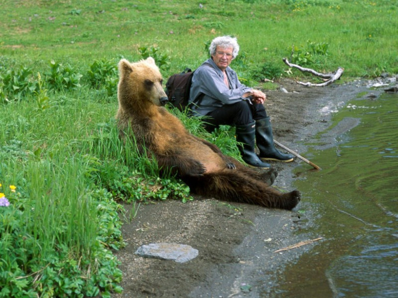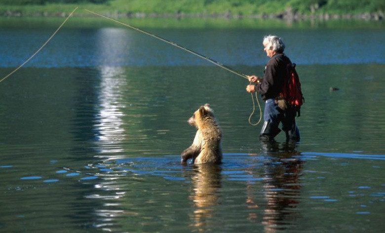 Медведь и рыбак обсуждают результаты рыбалки.