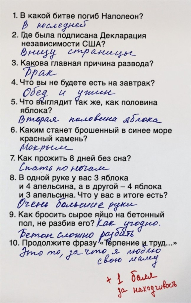 0 1 0 0 Картинки Неоспоримая детская логика Valentina автор опубликовано 8 лет назад — обновлено в 1 секунду назад 334 просмотров Если не знаешь ответа на поставленные вопросы , можно воспользоваться двумя путями : сразу признать поражение или проявить креативность )) Дети школа экзамен находчивость Valentina отслеживать Я очень хорошая и добрая )) Ваша реакция? 1 LOL 0 NICE 0 FAIL! 0 LOVED 0 OMG! 0 EW! 0 AWESOME! 0 FUNNY Комментарии Комментарий 0 comment Best Oldest Newest Write the first comment for this!