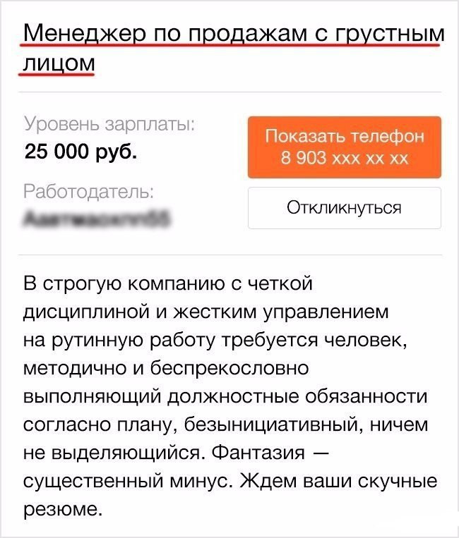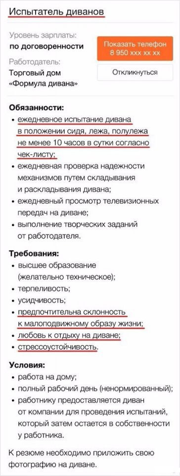 0 0 0 0 Картинки Такая работа - мечта многих Valentina автор опубликовано 8 лет назад — обновлено в 1 секунду назад 462 просмотров Подборка объявлении о найме на работу с приличным окладом , о которой многим приходится лишь мечтать )) А кому-то ведь и повезло ... объявления вакансии работа мечта прикольно Valentina отслеживать Я очень хорошая и добрая )) Ваша реакция? 0 LOVED 0 OMG! 0 LOL 0 EW! 0 AWESOME! 0 FUNNY 0 NICE 0 FAIL! Комментарии Комментарий 0 comment Best Oldest Newest Write the first comment for this!