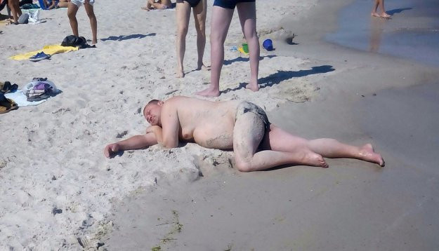 Принял на грудь и на пляж.