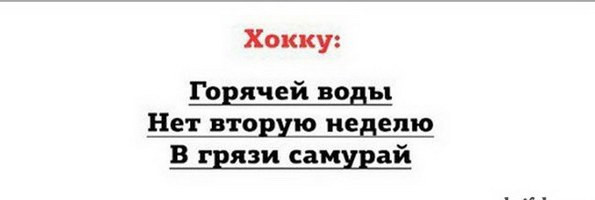 0 1 0 0 Картинки Забавное хокку Valentina автор опубликовано 8 лет назад — обновлено в 1 секунду назад 1,256 просмотров Хокку - жанр традиционной японской поэзии . В предлагаемых вашему вниманию картинках , конечно же , ненастоящее хокку , а лишь прикольная пародия на них с оттенком нашей реальности )) пародия поэзия прикольно Valentina отслеживать Я очень хорошая и добрая )) Ваша реакция? 1 NICE 0 OMG! 0 LOL 0 EW! 0 AWESOME! 0 FUNNY 0 FAIL! 0 LOVED Комментарии Комментарий 0 comment Best Oldest Newest Write the first comment for this!