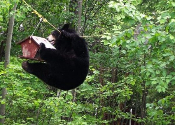 Медведь решил проверить что находится в кормушке.